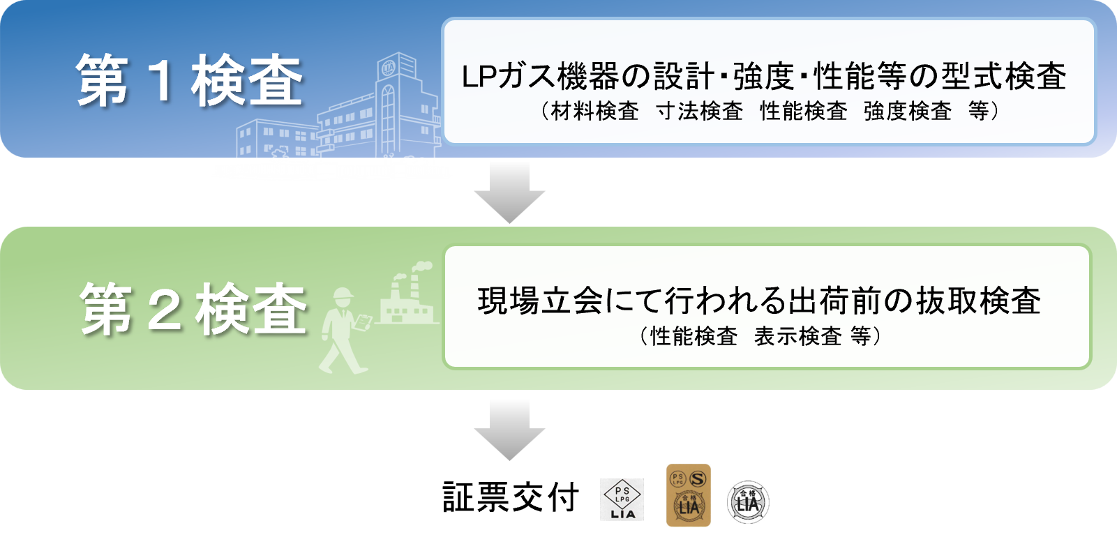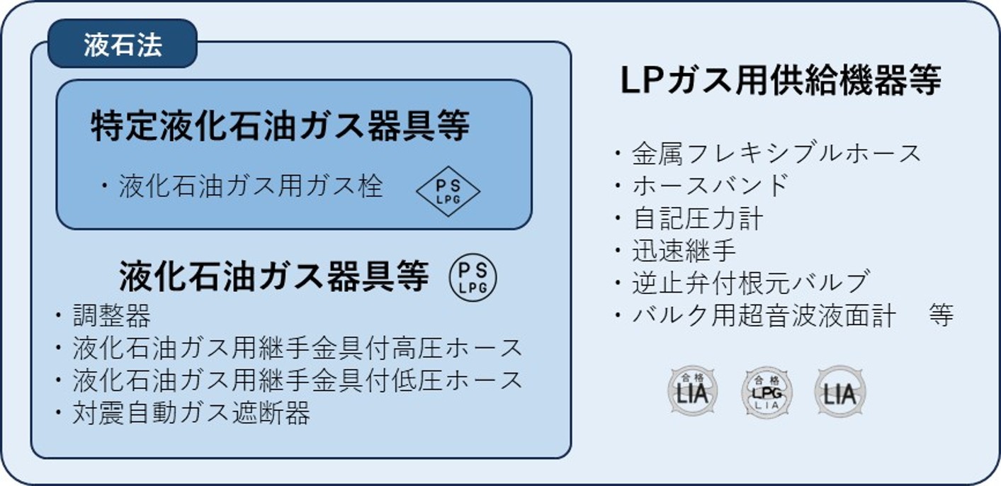 LPガス用供給機器の検査には、液化石油ガスの保安の確保及び取引の適正化に関する法律(以下「液石法」)に基づく検査と、LIA自主基準に基づく自主検査があります。